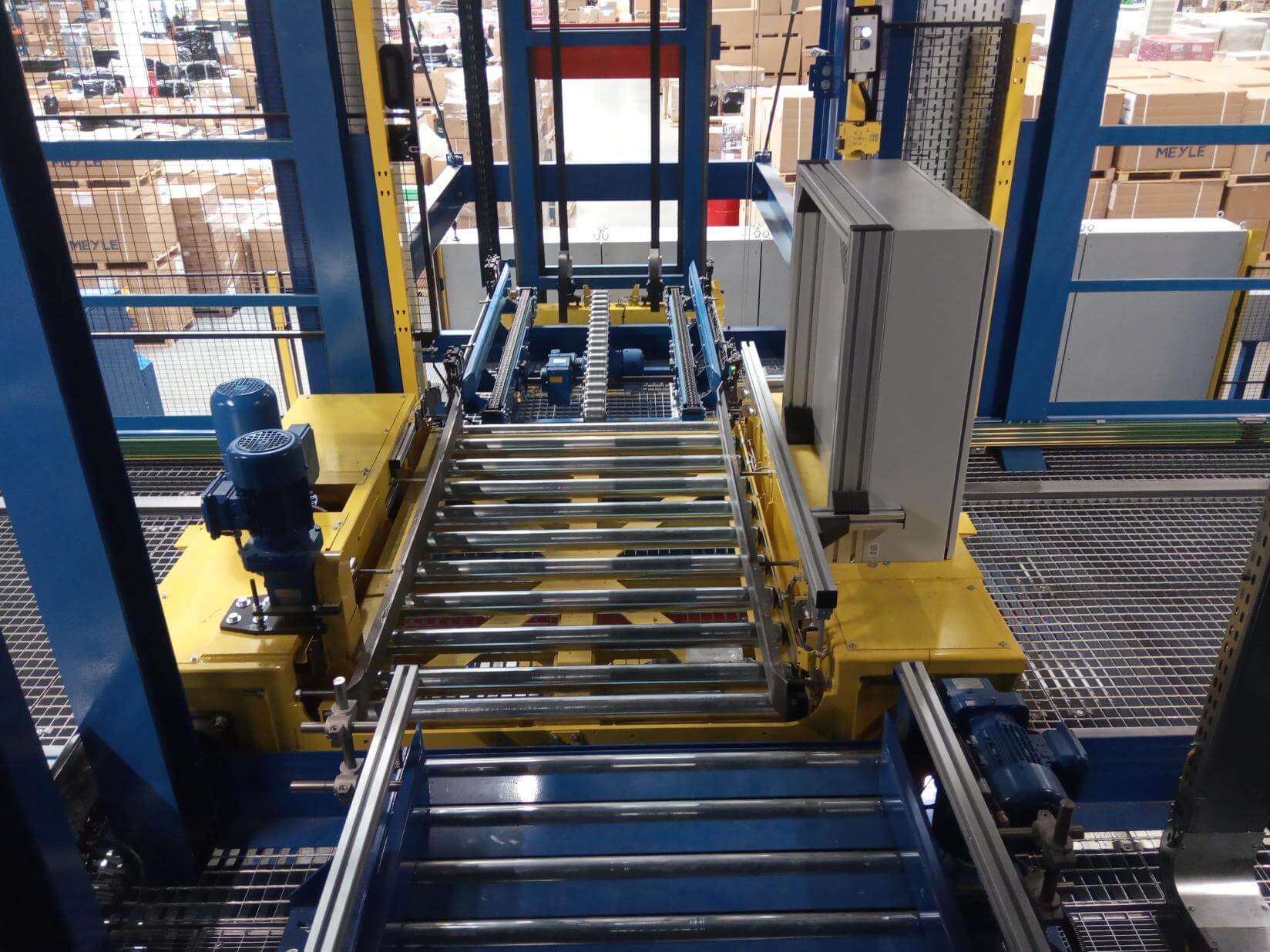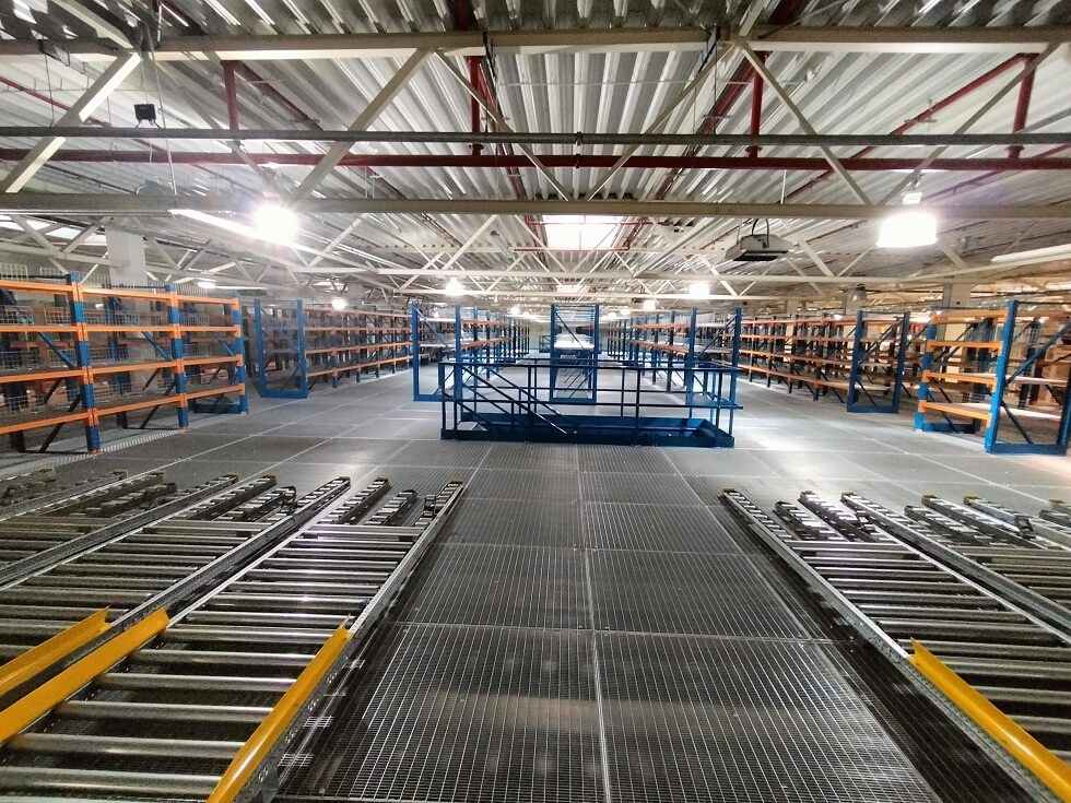 Palety za pomocą przenośnika transportowego trafiają na poszczególne piętra antresoli, a stamtąd za pomocą tzw. ‘transfer cara’ są umieszczane na przenośnikach rolkowych. Stąd osoby pracujące na piętrach antresoli pobierają towar i rozwożą go do miejsc docelowych na poszczególnych regałach.