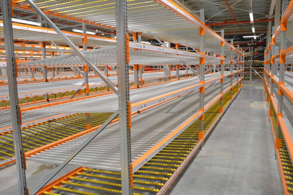 Podczas gdy na dolnym i górnym poziomie zostały zainstalowane rolki dla ergonomicznej obsługi (regały grawitacyjne), to na środkowych trzech półkach stosowaliśmy innowacyjne metalowe „Slide Decking”.
