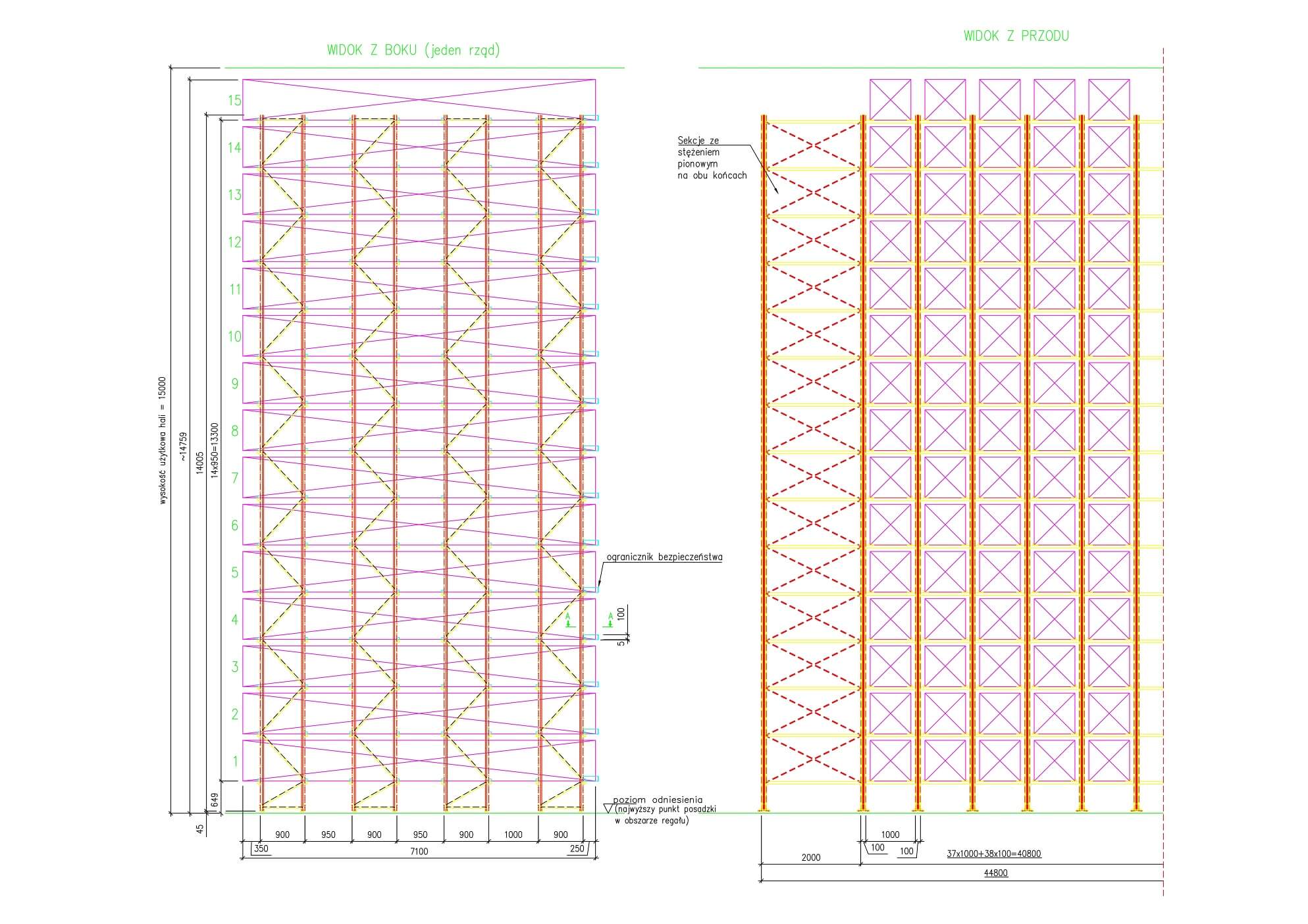 Zaprojektowana przez nas konstrukcja miała prawie 15 metrów wysokości i przeznaczona była do składowania materiału o wadze 1500 kg i długości 7000 mm. Podobnie jak w przypadku każdej konstrukcji, przeznaczonej do obsługi za pomocą automatycznej układnicy, kluczową rolę pełniła dokładność montażu( 1:1000 czyli 1 mm odchylenia dopuszczalny na 1 m )oraz stabilność samej konstrukcji, na którą ma wpływ m.in. odpowiednie przymocowanie konstrukcji kotwami chemicznymi do posadzki.