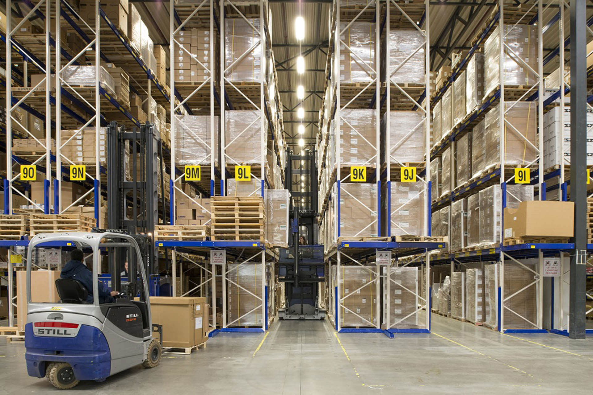 Przy obsłudze regałów paletowych rzędowych wózkami systemowymi, gdzie szerokość korytarzy roboczych jest niewiele szersza od takiego wózka (tzw. bardzo wąska ścieżka, VNA) można uzyskać naprawdę wysoki stopień wykorzystania przestrzeni magazynowej przy zachowaniu wspomnianych wcześniej atutów tego systemu. Popularnym rozwiązaniem dodatkowo zwiększającym wykorzystanie powierzchni w magazynie jest tzw. double-deep, czyli system do składowania dwóch palet na głębokość. Możemy pochwalić się realizacją regałów double-deep obsługiwanych wózkiem systemowym o wysokości 12m.